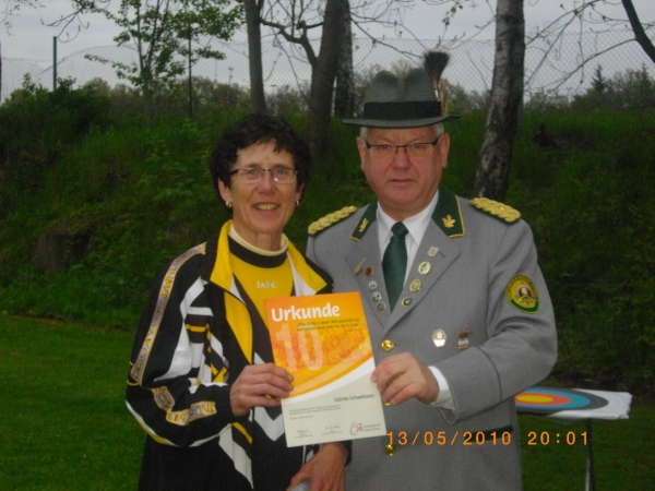 Am Ende des XII. Himmelfahrt-Stern-Turniers überraschte der 1. Vorsitzende des SV Bassum von 1848 die Bogenschützen mit einer besonderen Ehrung... Spartenleiterin und Trainerin der Bogenabteilung, Gabriele Schwettmann, wurde für ihre hervorragende Jugendarbeit und ihrem ehrenamtlichen Engagement für den Bogensport über 10 Jahre vom Landessportbund mit einer Urkunde und einem kleinen Präsent ausgezeichnet. Alle, besonders unsere liebe Gaby, waren von dieser Ehrung vollkommen überrascht ! Denn keiner der Bogenschützen hat davon etwas geahnt. Natürlich ist die Freude über diese Anerkennung riesengroß!