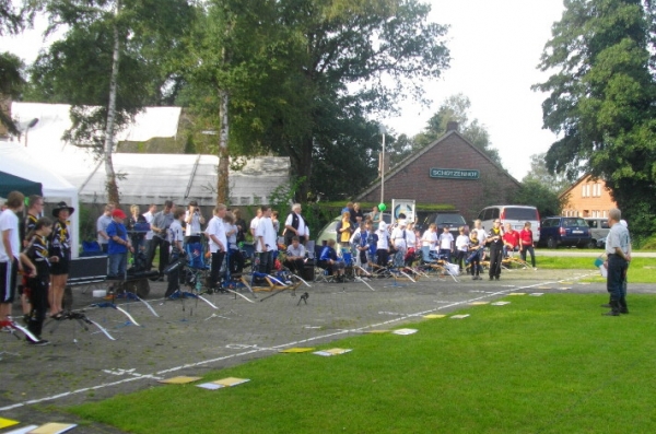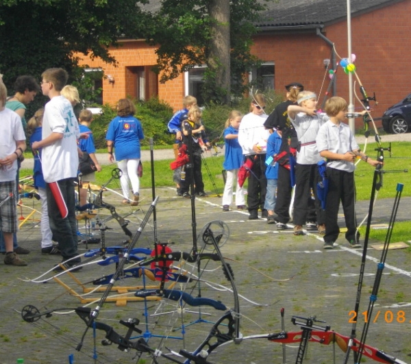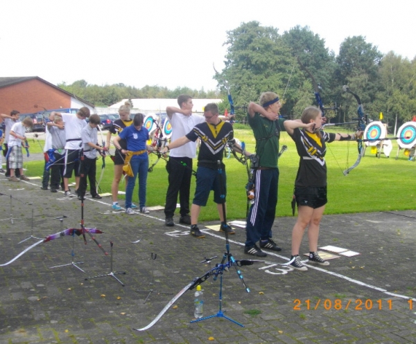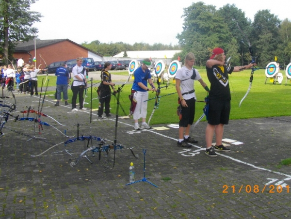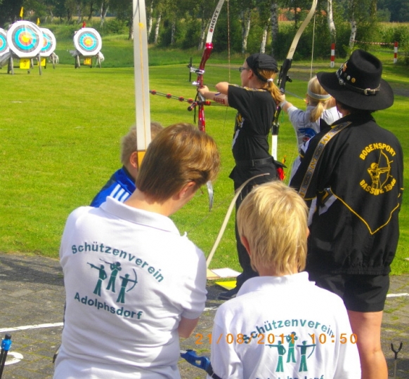Für die einen die erstmalige Teilnahme an einem Turnier, für die anderen eine gute Vorbereitung für die Deutsche Meisterschaft im Bogenschießen kommendes Wochenende. So war das Ergebnis der 1848er Bogenschützen beim "Bogenscheten för Jungs un Deerns" am 21.08.2011 des SV Adolphsdorfs. Jeder der neun Starter des SV Bassum konnte am Ende einen Treppchenplatz für sich verbuchen und mit insgesamt drei gemischten Mannschaften waren zusätzlich noch zwei Treppchen erreicht. Ergebnisse im Einzelnen: Bei ihrem ersten Start auf einem großen Turnier gelang Malou Sokoll in der Schülerklasse C weiblich mit 569 Ringen der Sprung auf den dritten Platz. Bei den Compoundschützen in der Schüler C weiblich - Klasse gelang es Alina Oostinga mit 613 Ringen, den ersten Platz zu belegen. Ihre Schwester Janine Oostinga setzte sich in der Recurve - Schülerklasse B weiblich mit 651 Ringen satte 51 Ringe vor ihre Konkurrentinnen auf den 1. Platz. Bei den Recurve - Schülern A männl. trumpfte Aaron Niemann mit 634 Ringen auf und ließ seine Mitstarter locker hinter sich. In der Jugendklasse sowohl im Compound- als auch im Recurvebereich war die Dominanz der 1848er deutlich zu spüren. Mit 695 Ringen setzte Christian Noack in der Jugendklasse Compound das Tageshöchstergebnis. Ihm nacheifernd schoß sich Jo Hanna König bei den weibl. Jugendcompoundschützen mit 679 Ringen auf den 1.Platz. In der Recurve - Jugend setzte sich DM-Qualifikant Marcel Schwettmann mit 656 Ringen durch. Allein bei den Mädchen mussten sich Franziska Frerichs (634 Ringe/2.Platz) und Svenja Böttcher (630 Ringe/3.Platz) der amtierenden Landesmeisterin Mascha Heins vom SSV Tarmstedt beugen, die mit 677 Ringen Akzente setzte. In der gemischten Mannschaftswertung erreichten mit 1959 Ringen Bassum II mit Christian Noack, Aaron Niemann und Svenja Böttcher den 1. Platz und konnten so den Wanderpokal mit nach Bassum nehmen. Bassum I mit Marcel Schwettmann, Franziska Frerichs und Janine Oostinga erreichten 1941 Ringe, Platz 3, Bassum III mit Jo Hanna König und den beiden Schülern C, Alina Oostinga und Malou Sokoll, erreichen mit 1861 Ringen den 5.Platz. Gratulation an alle Schützen für diesen erfolgreichen Turnierstart. Die gute Jugendarbeit in der Bogensparte des SV Bassum von 1848 hat sich einmal wieder ausgezahlt.