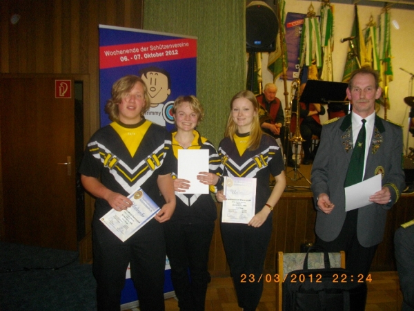 Desweiteren wurden die Landesrekordurkunden des NWDSB aus dem Sportjahr 2011 verliehen: Im Einzelwettbewerb hatte Janine Oostinga in der Schülerklasse B jeweils den Landesrekord in der Halle und auch FITA geknackt. In der Jugendklasse erzielte die Mannschaft mit Jana Lemke, Franziska Frerichs und Marcel Schwettmann einen neuen FITA-Rekord.