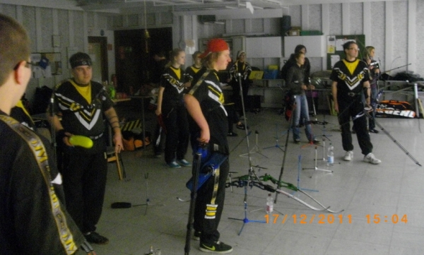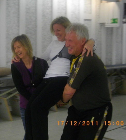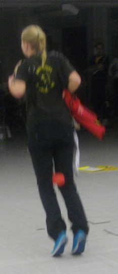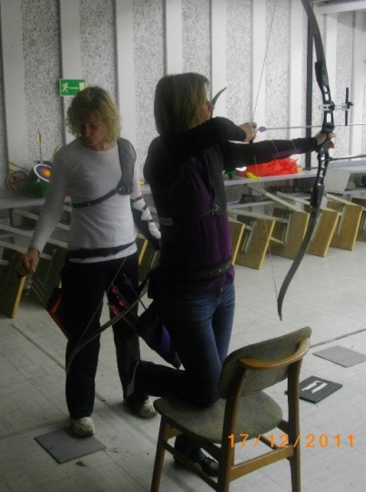 Aber nun ging es los! Nach kurzer Scheibeneinteilung durften die Bogenschützen ihr Können knieend oder sitzend auf dem Stuhl, auf wackeligem Luftpolster oder mit einem Luftballon zwischen den Beinen beweisen. Zur sportlichen Ertüchtigung kam Bockspringen und das Tragen der Scheibenkollegen. Zwischendurch gab es auch einige Gesangseinlagen, bei denen Dieter Bohlen die wahre Freude für DSDS gehabt hätte *wechschmeiß*. Allerdings erspare ich der Öffentlichkeit diese Ohrengenüsse!!!