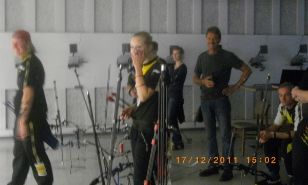 Kaum war die erste Gruppe abgeschlossen, trafen auch schon die "Großen" ein. Ab Juniorenklasse darf am Nachmittag gestartet werden, dementsprechend war die Halle auch gut besucht. Auch die Erwachsenen mussten zunächst das Schießprogramm absolvieren und die eine oder andere "Fiesigkeit" über sich ergehen lassen. Der Modus ist der gleiche wie am Vormittag. Allerdings wird dann erst am Abend beim gemeinsamen Abendessen der Sieger bekanntgegeben. Bevor es aber losgehen konnte, sprach Jugendsprecher Christian Noack erst einmal ein Machtwort :-) !!! Die Junioren hatten in Zusammenarbeit mit den Erwachsenen wieder einmal etwas für die Trainer vorbereitet. Ab sofort ist der Vorgarten von Schwettmanns und Oostingas mit einem wunderschönen Vogelhäuschen verziert, aus dem klar hervorgeht, welchen Sport sie betreiben.