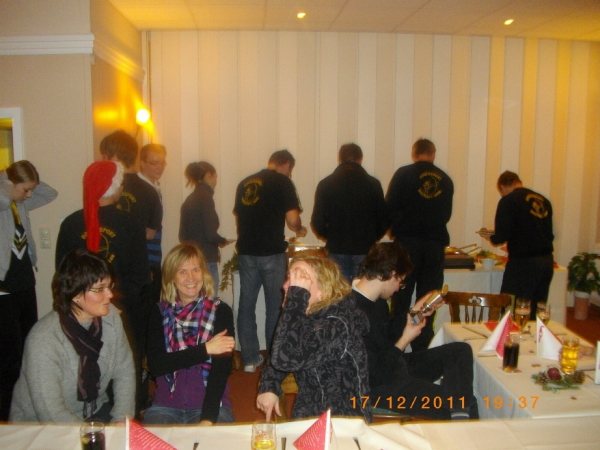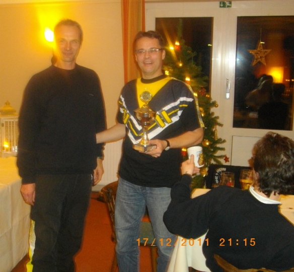 Am Abend nach einem genüßlichen Abendessen, dass Heiner in der Sport-Arena wieder vorzüglich zubereitet hatte, ging es dann zur Siegerehrung und Verleihung des traditionellen Bernd-Brümmer-Preises, der mal nicht auf Grund besonderer Schießergebnisse sondern seit 1993 als Ehrung für besonders engagierte Mitglieder verliehen wird. Dieses Mal hatte Martin Schulze das große Los gezogen. Ihm gelang heute alles! Zunächst hatte er am Nachmittag immer die richtigen Buchstaben getroffen und konnte sich im Finale gegen Compounder Gabor Geges durchsetzen und dann verlieh ihm auch noch der Bernd-Brümmer-Pokal - Besitzer 2010, Detlef Meinert, diesen Pokal für seinen besonderen Einsatz in Sachen Scheibenständer und Bogenbau-Kurs. Na wenn das kein schöner Jahresabschluß ist !?!?! Nun hat Martin die Aufgabe, alle Mitglieder über das Jahr 2012 zu beobachten.