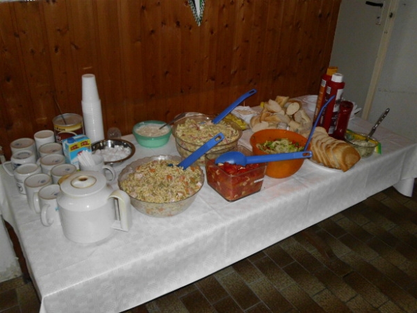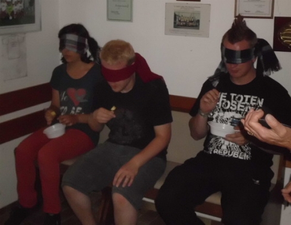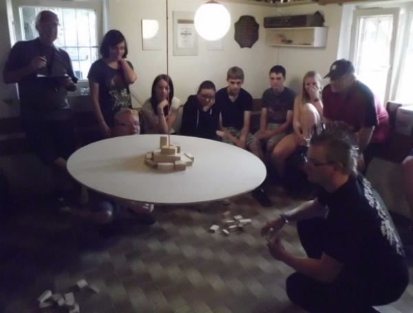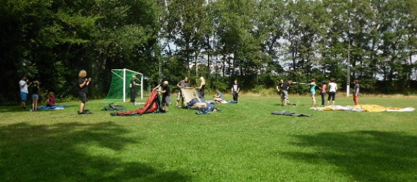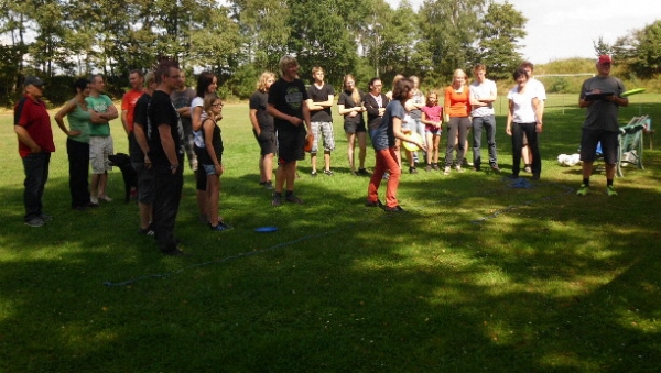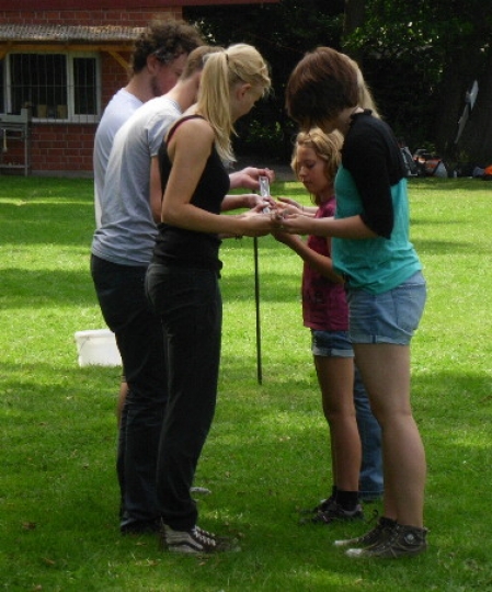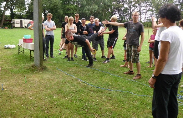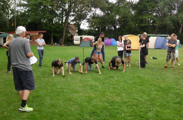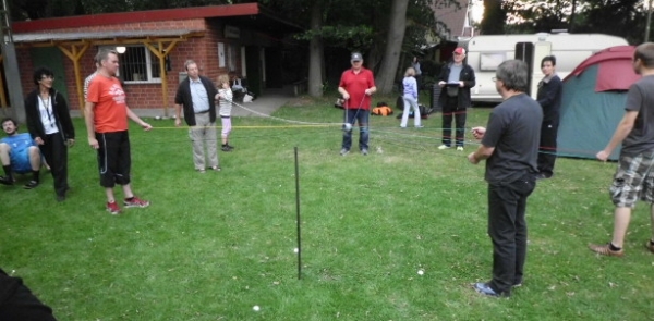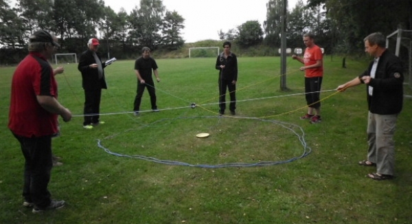 Aber zunächst kamen die Teamspiele dran. Vier Gruppen á sieben Mitglieder wurden gebildet, die im Wettbewerb gegeneinander antraten. Da gab es einmal wieder die verschiedenen Staffeln: vom Raumüberwinden mit nur vier Füßen (bei 7 Personen) über das beliebte Wasser transportieren in Röhren bis zum Wandern mit Brettern untern den Füßen hieß es, die Probleme gemeinsam zu bewältigen. Dann gab es wieder einmal Frisby- und Ringzielwurf für die Hand-Auge-Koordination, im Anschluß wurde der Schätzsinn mit verschiedenen Gewichten, Längen- und Raummaßen und dann der Geschmackssinn mit netten Leckereien geprüft. Zum Schluß hieß es, mit Hilfe eines geknickten Rohres an Schnüren einen Golfball aufzunehmen und ihn über eine gewisse Distanz zu einem Zielpunkt mit Hindernis auf Zeit zu bringen. Im Dunkeln war dann wieder das Können mit dem Bogen gefragt, wenn es darum ging, die Scheibe bei Fackelschein zu treffen und ein Feuerwerk wurde selbst veranstaltet, in dem mit Wunderkerzen bespickte Pfeile in die Luft geschossen wurden. Danach konnten dann die Sportler beim Schein des Lagerfeuers ihre Erfahrungen austauschen und Speck auf Brot brutzeln.