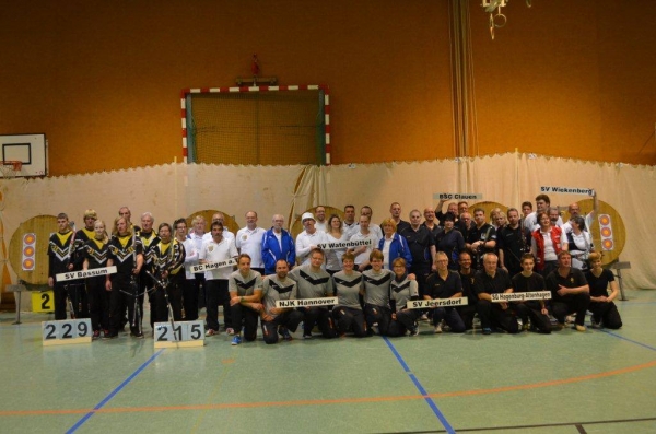 Zum Schluß kam es zu einem Topmatch zwischen dem Ex-Bundesligisten NJK Hannover und dem SV Bassum. Mit 57 : 56 ging der NJK in der ersten Runde in Führung, in der 2. Runde trumpften die 1848 mit einer 59 auf und drehten den Stand auf 115 : 114. Es folgten von Seiten der 1848 eine weitere 59 und eine 55, so dass es am Ende 229 : 226 für den SV Bassum stand.